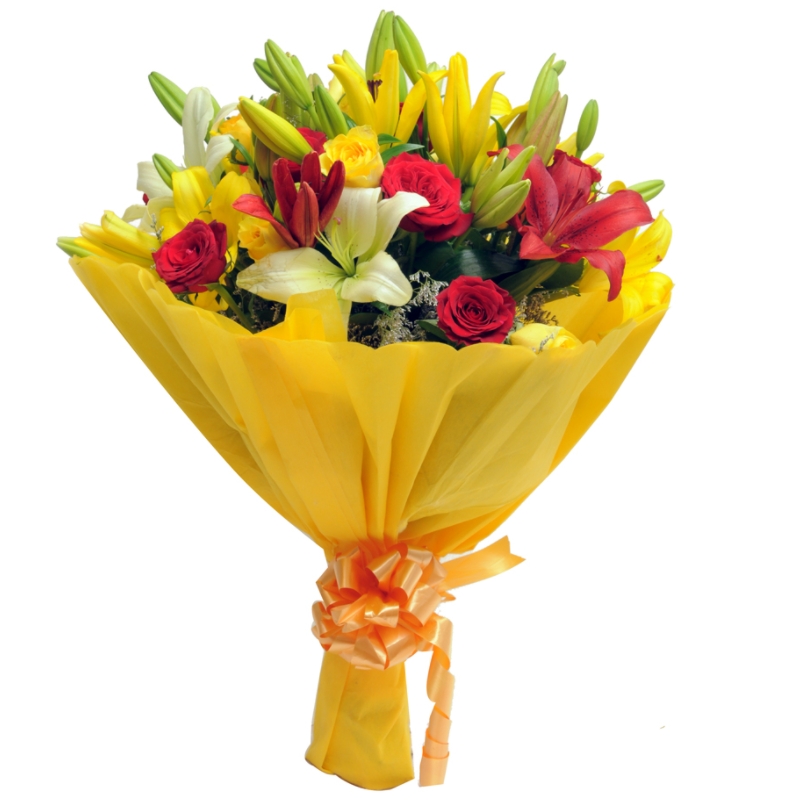Букет состоит из 5 красных роз, 5 желтых роз, 2 ветки белой лилии, 4 ветки желтой лилии, зелень, красивая упаковка, атласная лента.