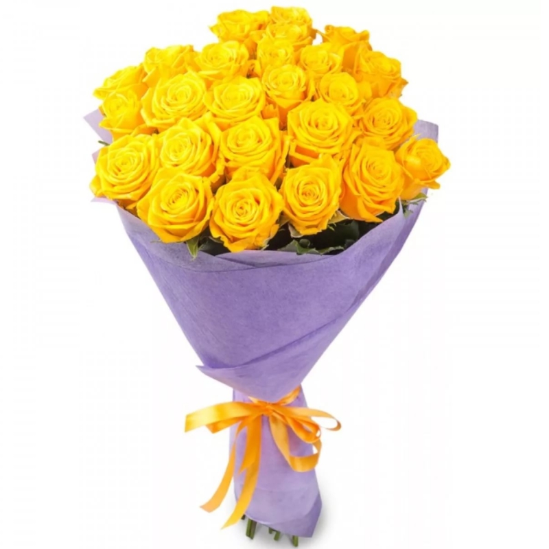 Букет состоит из 25 желтых роз, красивая упаковка, атласная лента.