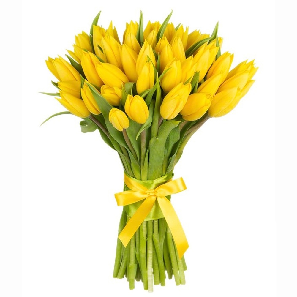 Букет состоит из 35 желтых тюльпанов, прозрачная упаковка, желтая лента.
