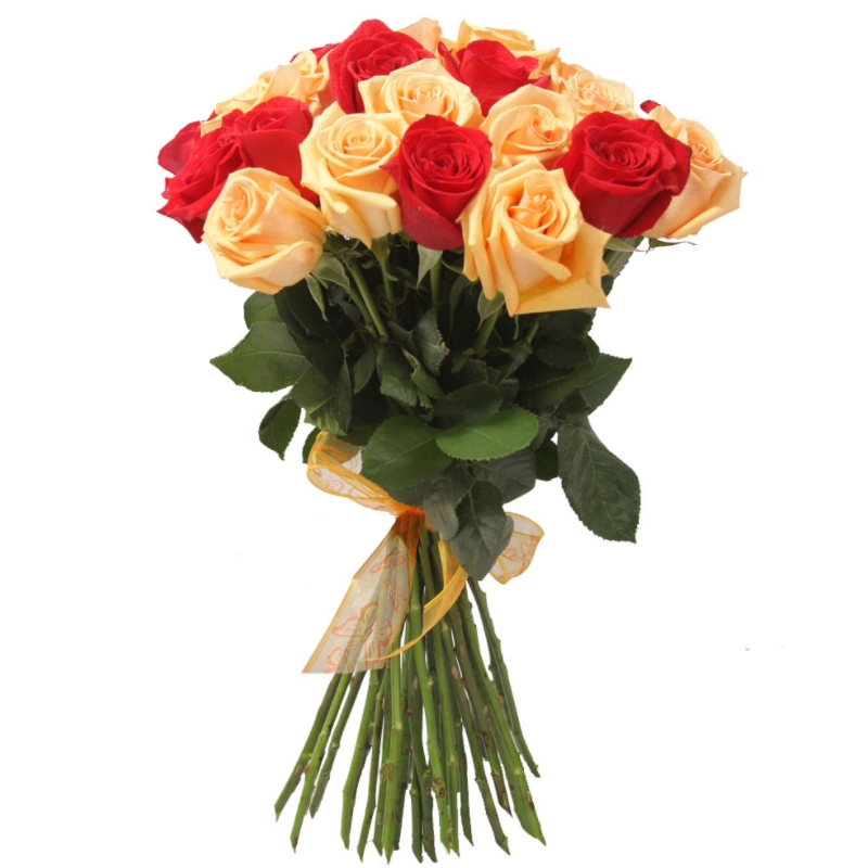 Букет состоит из 10 кремовых роз, 9 красных роз, прозрачная упаковка, атласная лента.